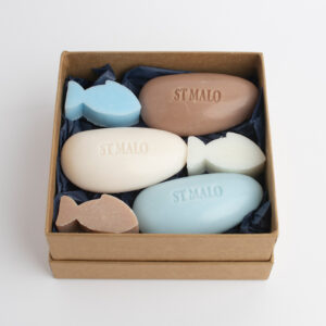 20.50€Composition : 3 galets de Saint-Malo (blanc, exfoliant , gris), 3 savons poissons (bleu, blanc, exfoliant).